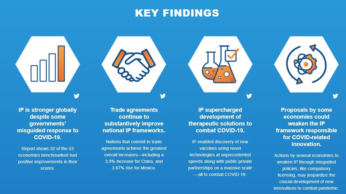 - The 2021 Index illustrates that economies with the most effective IP frameworks are more likely to achieve the socio-economic benefits needed to combat COVID-19, including greater access to venture capital, increased private sector investment in research and development, and over 10 times more clinical trial activity.