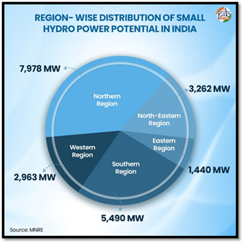 - India has a total SHP potential of 21,133 MW across 7,133 sites, of which about 5,171 MW (24.5%) has already been developed, leaving a large untapped capacity. This potential is spread across regions: North (38%) and North-East (15%) have major untapped resources, while the South (26%) and West (14%) have better infrastructure for faster development, and the East (7%) has scope in rural and tribal areas.