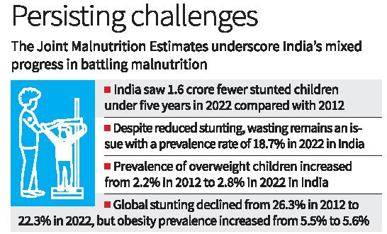 - Reduction in Stunting: Corresponding with global and regional trends, India continues to show a reduction in stunting and recorded 1.6 crore fewer stunted children under five years in 2022 than in 2012.