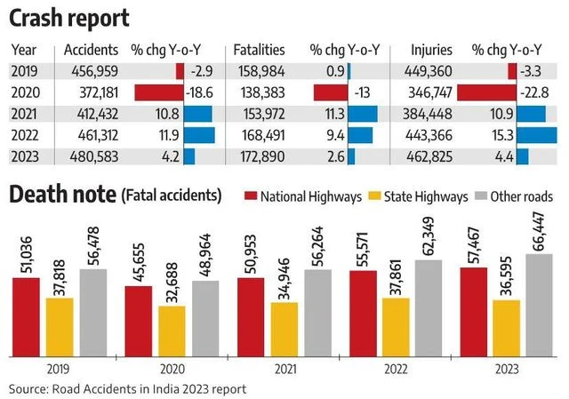 - Surge in Fatal Accidents: Fatal road accidents increased from 1,55,781 in 2022 to 1,60,509 in 2023, marking a 3.04% growth.