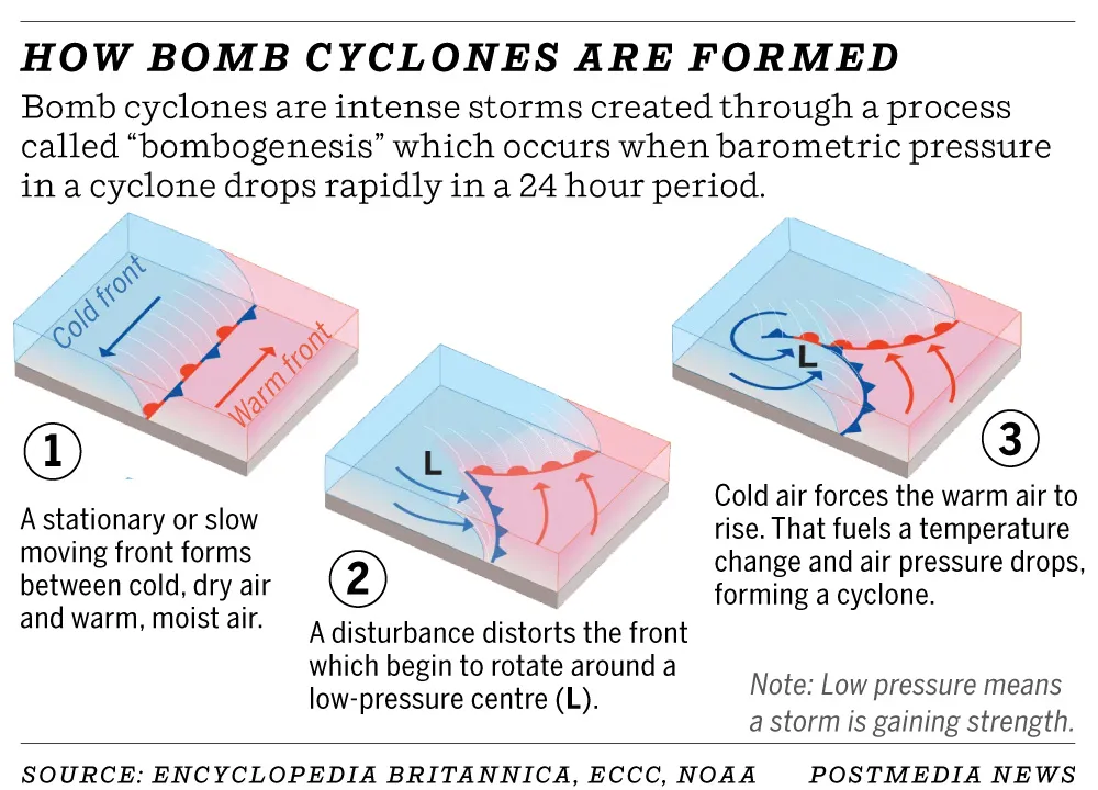 - A bomb cyclone occurs when a low-pressure system’s pressure drops at least 24 millibars in 24 hours, rapidly strengthening winds due to the increased pressure gradient—a process called bombogenesis.