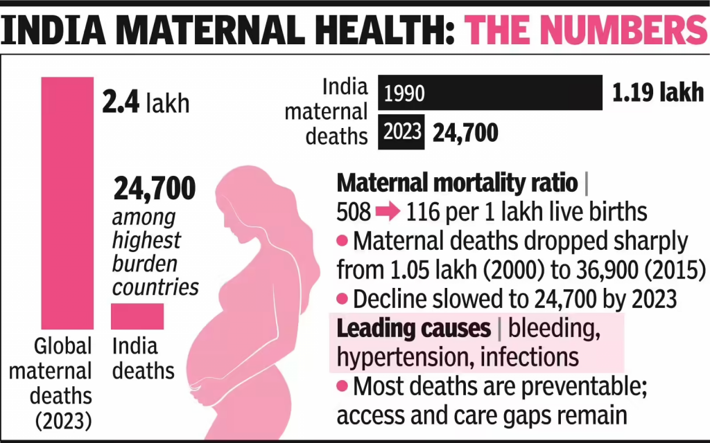 • A study published in The Lancet found that India remains among the countries with the highest number of maternal deaths globally.