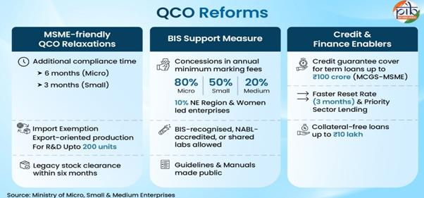 - To ensure that Quality Control Orders (QCOs) do not disrupt domestic production, the Government has implemented them in a phased and MSME-friendly manner through the Bureau of Indian Standards (BIS).