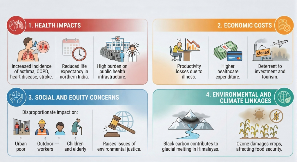 - धूल और शहरी प्रदूषण का फँसना: वाहनों और दहन स्रोतों से स्थानीय उत्सर्जन सबसे महत्वपूर्ण योगदानकर्ता हैं।