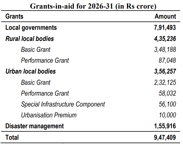 - The Commission has recommended grants worth ₹9.47 lakh crore over the five-year period. These are primarily directed towards local bodies and disaster management.