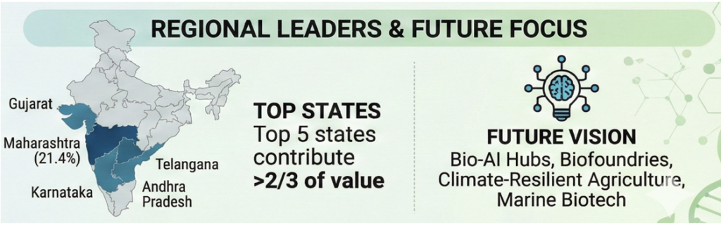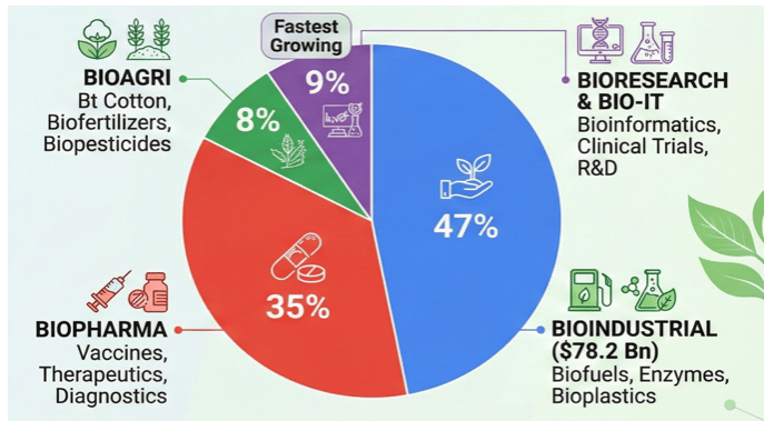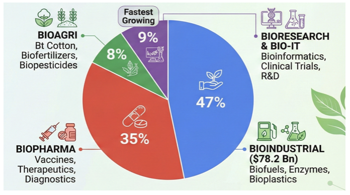 - Other Key Measures: National Mission on Bioeconomy (2016), National Biopharma Mission, Bio-RIDE, BioNEST incubators, Global Biofuels Alliance & National Biological Data Centre (NBDC).
