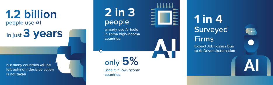 - Two-thirds of people in high-income nations already use AI tools, but usage in many low-income economies remains close to 5%.