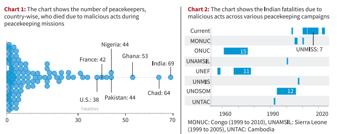 • The Charts below show the number of peacekeepers, country-wise, who died due to malicious acts during peacekeeping missions.