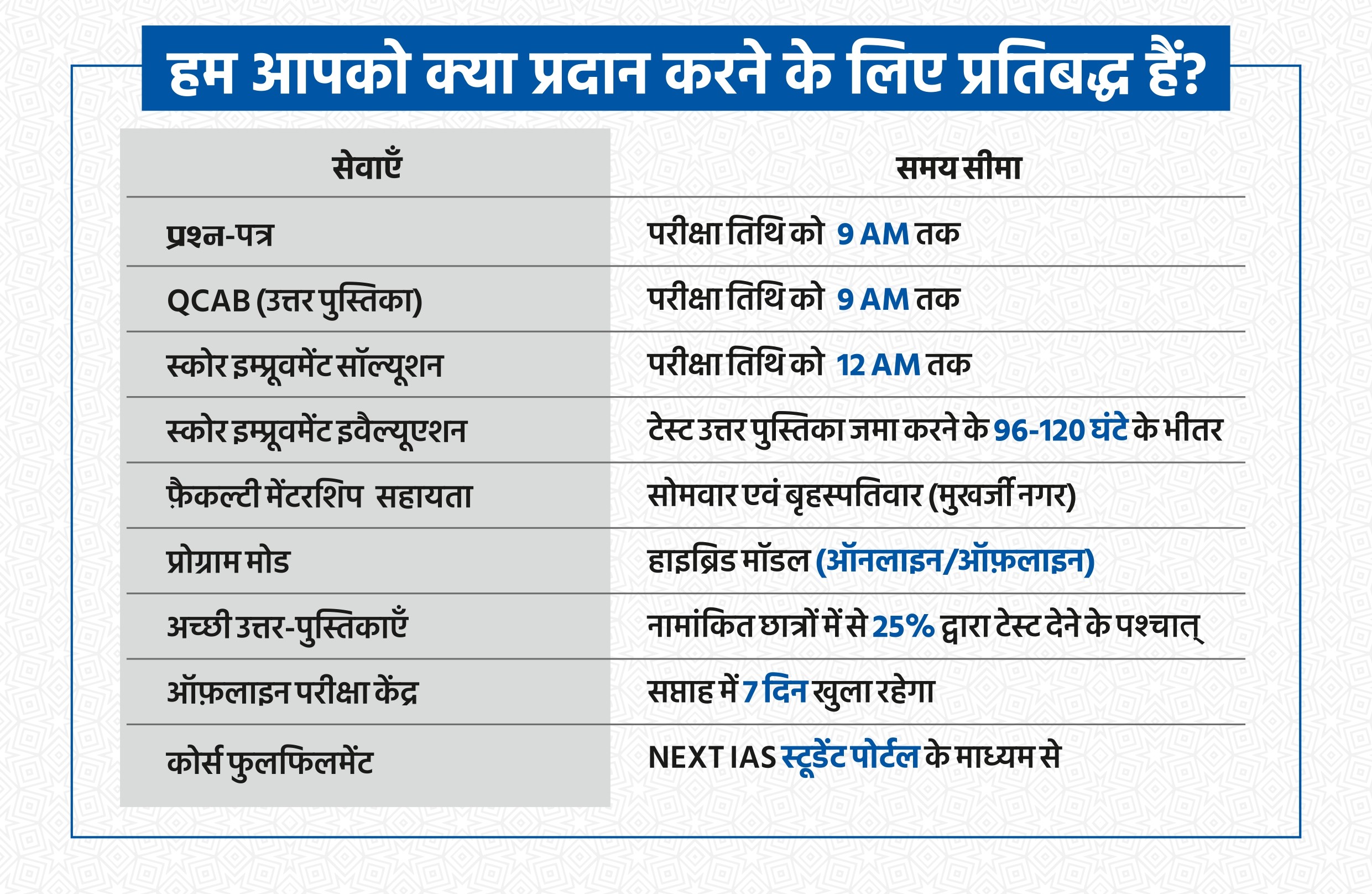 आपकी उत्तर-पुस्तिका कभी भी ढेर में नहीं छोड़ी जाती है। प्रत्येक उत्तर-पुस्तिका 72-96 घंटों के भीतर मूल्यांकन कर वापस लौटा दी जाती है। साथ ही, इसमें आपके प्रदर्शन और विशिष्ट सुधार क्षेत्रों के आधार पर सटीक सुझाव भी दिए जाते हैं।