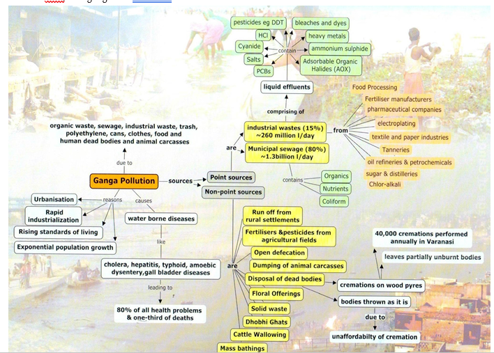 - In the Ganga basin approximately 12,000 million liters per day (mld) sewage is generated, for which presently there is a treatment capacity of only around 4,000 mld.