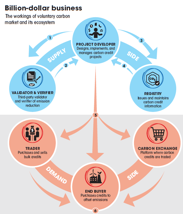 - Voluntary carbon market is a sophisticated ecosystem. It involves a multitude of players to ensure that a carbon offset project delivers on its claims—that it avoids or removes greenhouse gases from the atmosphere.