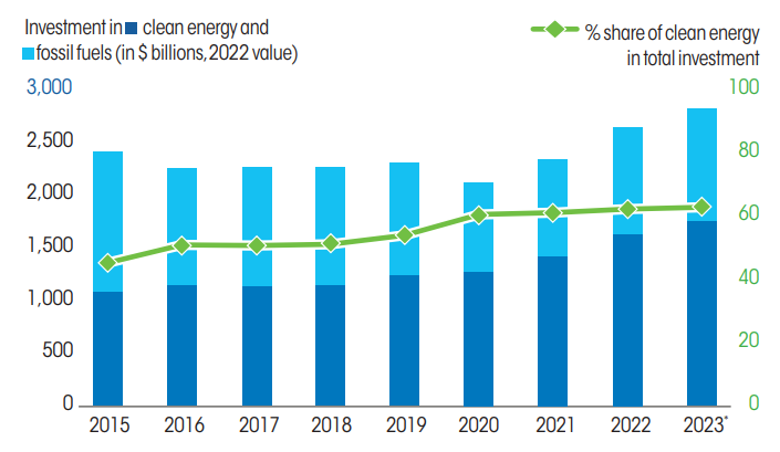- Investment in fossil fuels, on the other hand, surpassed pre-pandemic levels in 2022 and 2023.