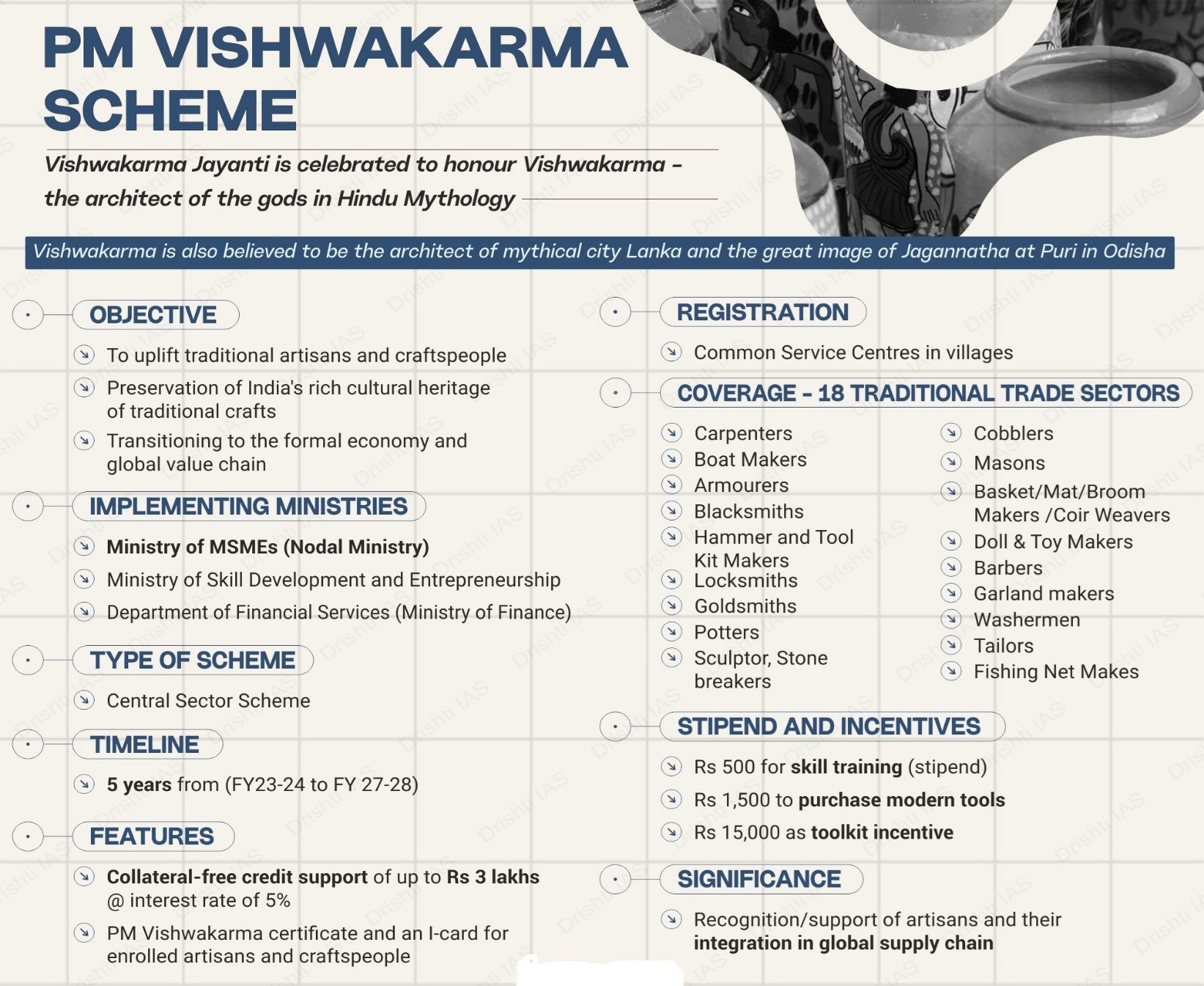 - This scheme is designed to uplift traditional artisans and craftspeople engaged in various occupations like blacksmithing, goldsmithing, pottery, carpentry, and sculpting.