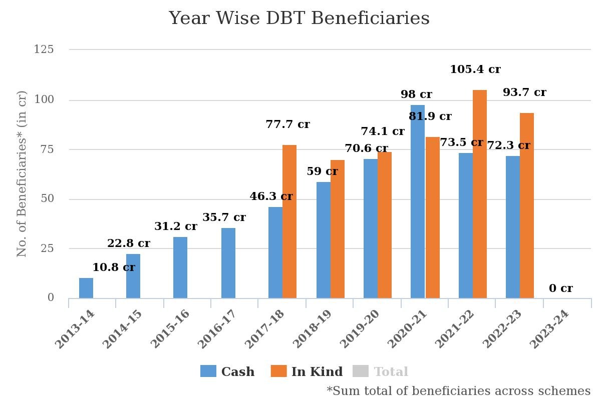 - DBT in India not only entails cash support to eligible beneficiaries but also in-kind transfers to them, covering over 300 Central and more than 2000 State schemes.