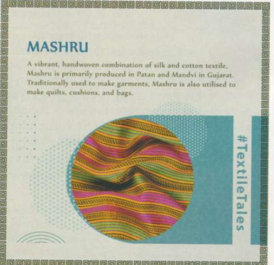 - Mashru textiles are known for their unique blend of silk and cotton fibers.