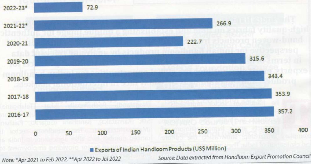 - Consistent Performance Pre-Covid: Indian handloom product exports maintained a robust performance, exceeding USD 300 million annually from 2016-17 to 2019-20.