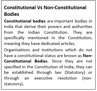 - Constitutional bodies are the foundation of democracy as an institution. Their presence has been a critical factor in the resilience of Indian democracy. Considering the underlying philosophy and structural needs of democracy, constitutional bodies are needed to establish, protect, and perpetuate democratic ideals.