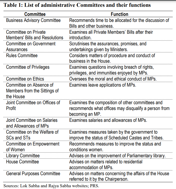 - Administrative Committee: Both Houses of Parliament also require significant administrative support for their day-to-day functioning. The Houses have set up different Committees, such as the Business Advisory Committee which helps decide the daily agenda of Parliament. Table 1 provides a list of administrative Committees in Parliament.